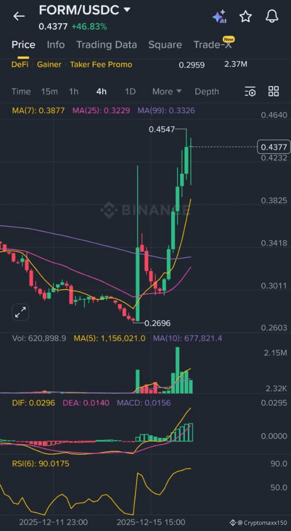 FORM surged from the $0.29 area to highs near $0.45, marking one of its strongest short-term moves in recent weeks. The rally was supported by expanding volume, signaling genuine demand rather than a thin liquidity spike. Such moves typically indicate a shift in market structure from accumulation to expansion.