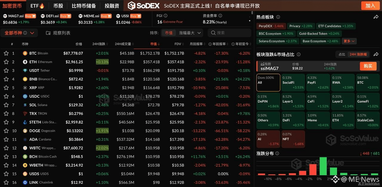 ME News 消息,12 月 17 日(UTC+8),根据 SoSoValue 数据,加密市场普遍反弹上涨,其中,Bitcoin(BTC)上涨 2.01%,突破 8.7 万美元,同时,Ethereum(ETH)上涨 0.12%,仍在 2900 美元附近窄幅震荡。值得注意的是,MAG7.ssi 上涨 1.79%,DEFI.ssi 上涨 0.34%,MEME.ssi 上涨 1.28%。