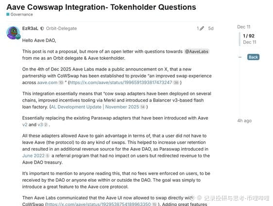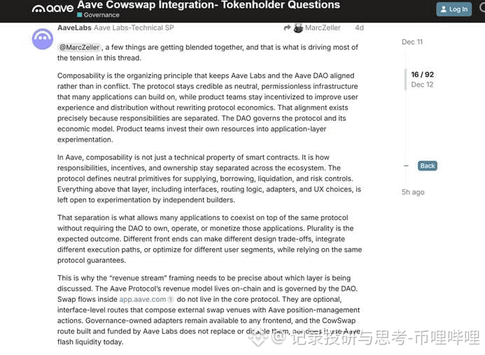 此外,Labs 强调 CoW Swap 的集成主要是为了提升用户体验(更优报价和抗 MEV),而非单纯为了收入,且该收入将用于维持前端的高昂运维成本,因为“DAO 并不直接补贴产品的日常开发支出”。