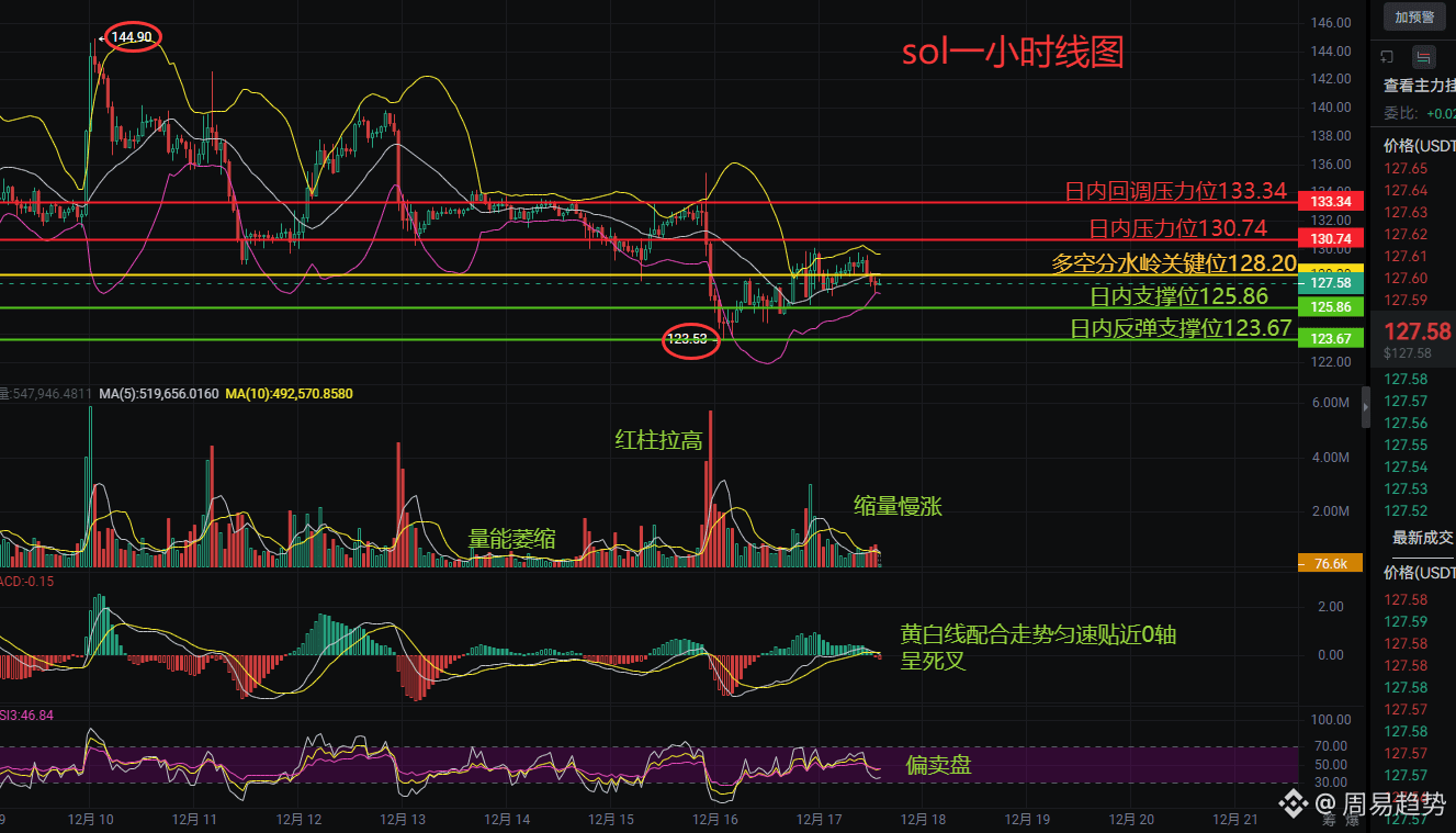 目前价格在127.6附近挣扎,如果连128.20都站不稳,大概率要往下摸125.86,甚至123.67。