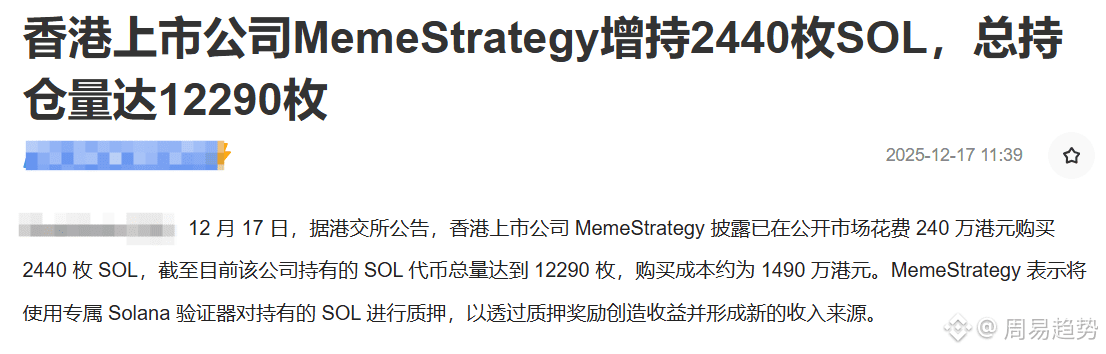 港股公司MemeStrategy这次加仓2440枚SOL,累计持有近1.23万枚,还准备质押赚收益。这说明什么?机构也在布局Solana生态,看好长期价值。
