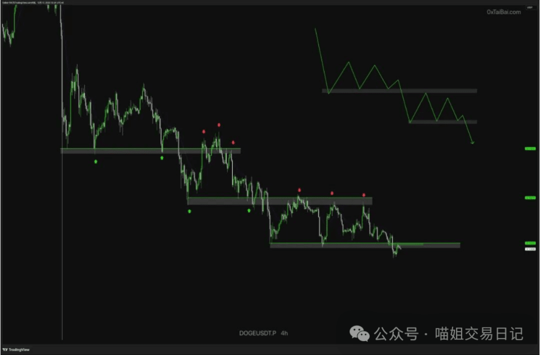 The Dogecoin 4-hour chart is a textbook case of 'horizontal support and resistance.' Support and resistance levels are not strictly a single line (a price with decimals), but rather a price range (allowing for dynamic tolerance space due to the struggles of bulls and bears attempting to break through at key positions).