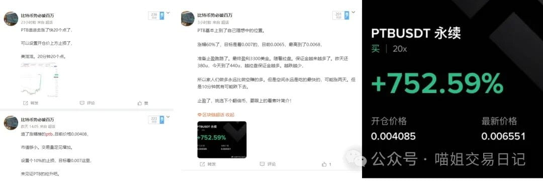 The PTB recommended on Weibo and Coin An yesterday has basically reached my ideal position, with a 60% increase. The target is 0.007, currently at 0.0065, with a high of 0.0068, and I took profits. Final profit was 3300 USD, looking for the next doubling coin, stay tuned for Meow Sister!