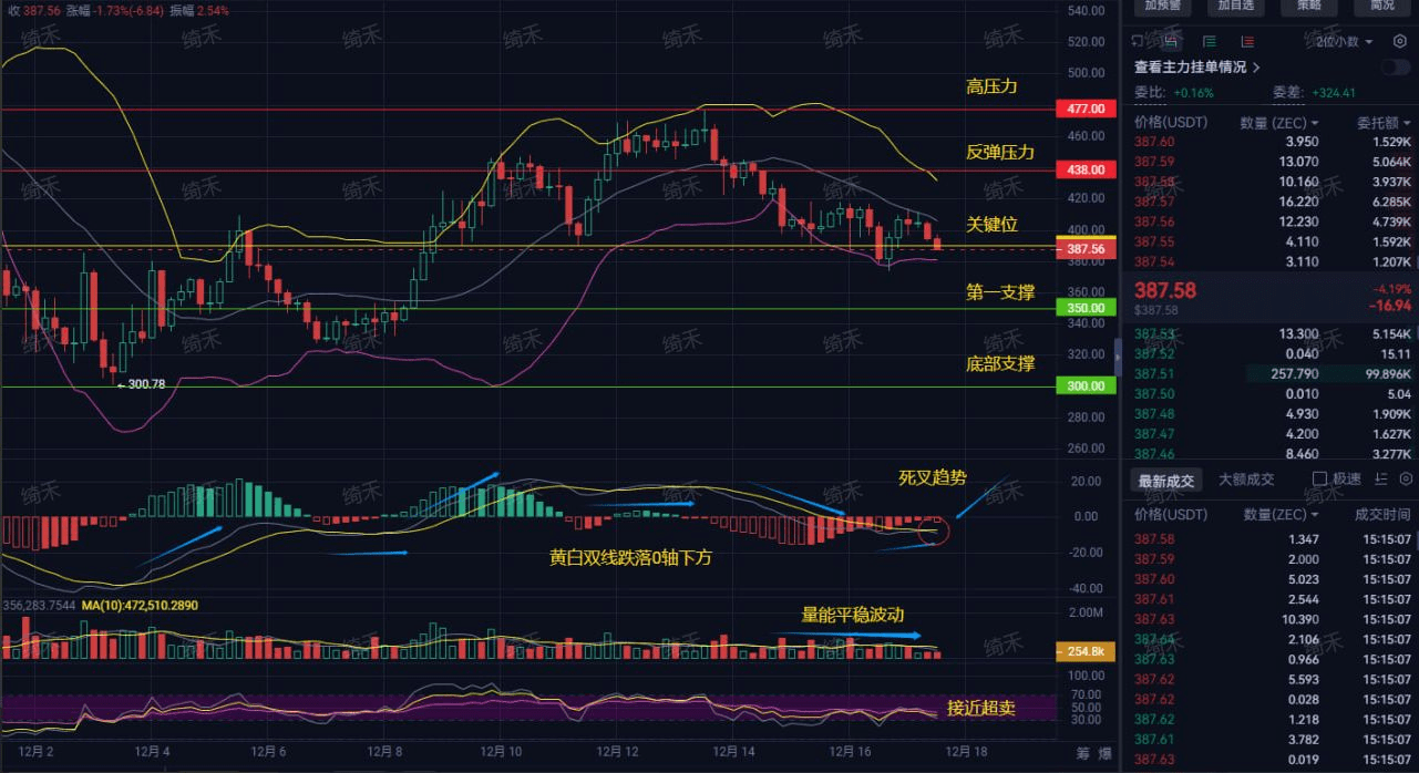 Combining the 'tricks' on the news front and the 'downtrend' on the technical front, it is extremely difficult for ZEC to directly reverse and surge to 438 or even higher tonight or in the short term! The greater possibility is that it will repeatedly grind at the 387 position until everyone loses patience. Once it breaks below 387, looking for support at 350 will be a high-probability event.
