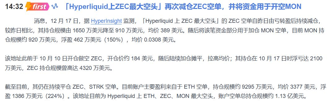 Just now, I came across a message saying that the 'largest short' who was aggressively shorting ZEC on Hyperliquid has started to reduce his position again! From a $16.5 million ZEC short position, he has reduced it all the way to $9.1 million, looking like he's 'surrendering and retreating'. Newbies will definitely be excited: Wow, the shorts have run away, does that mean a big rebound is coming? Should we rush in quickly?
