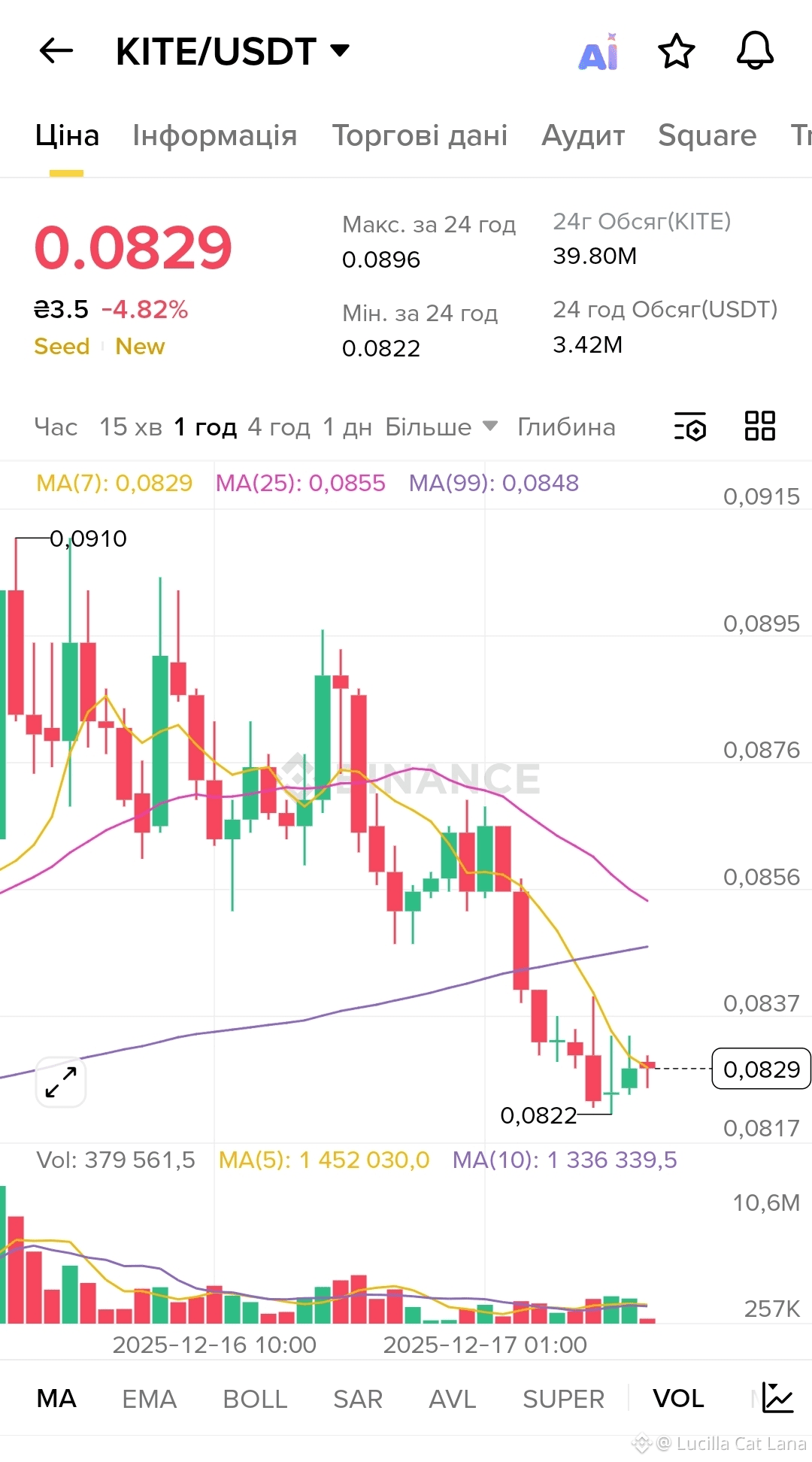 Зараз сиджу з чашкою кави і дивлюся на графік $KITE – ціна 0.0829, мінус 4.82% за добу. Падіння, так. Але знаєте що? Мене це не лякає. Навпаки, відчуваю, що зараз якраз той момент, коли розумні гроші накопичують, поки всі інші панікують. Грудень 2025 року, і ми на порозі чогось величезного з @GoKiteA – того, що більшість просто ще не бачить.