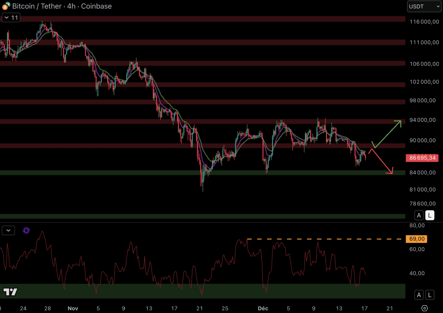 Despite the rebound, the king of cryptocurrencies remains fragile in 4H. As a result, it continues to struggle against the bearish moving averages (EMA 9/EMA 18), and it has failed to break through the resistance at $89,000: