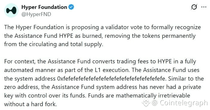 The system address was designed without control mechanisms, making the funds irretrievable without a hard fork. “By voting ‘Yes,’ validators agree to treat the Assistance Fund HYPE as burned,” Hyper Foundation wrote.