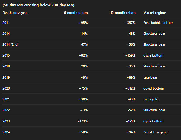 "Lagging indicator", Siegel wrote on platform X, attaching a table covering every death cross for Bitcoin since 2011. The summarized statistics are clear: the average return six months after a death cross is +30%, the average return for 12 months is +89%, and the positive hit rate is 64%.
