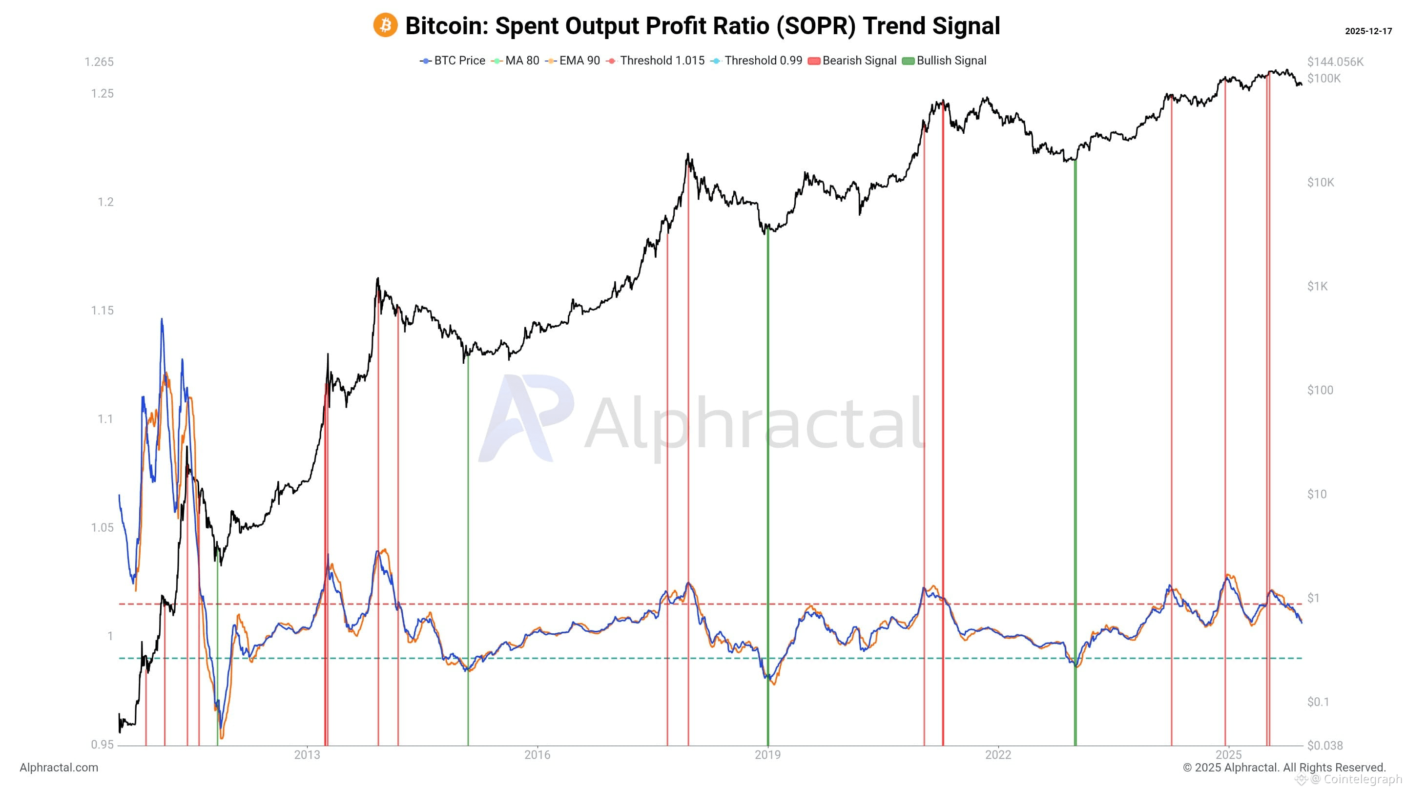 Bitcoin’s Spent Output Profit Ratio (SOPR) trend signal. Source: Alphractal