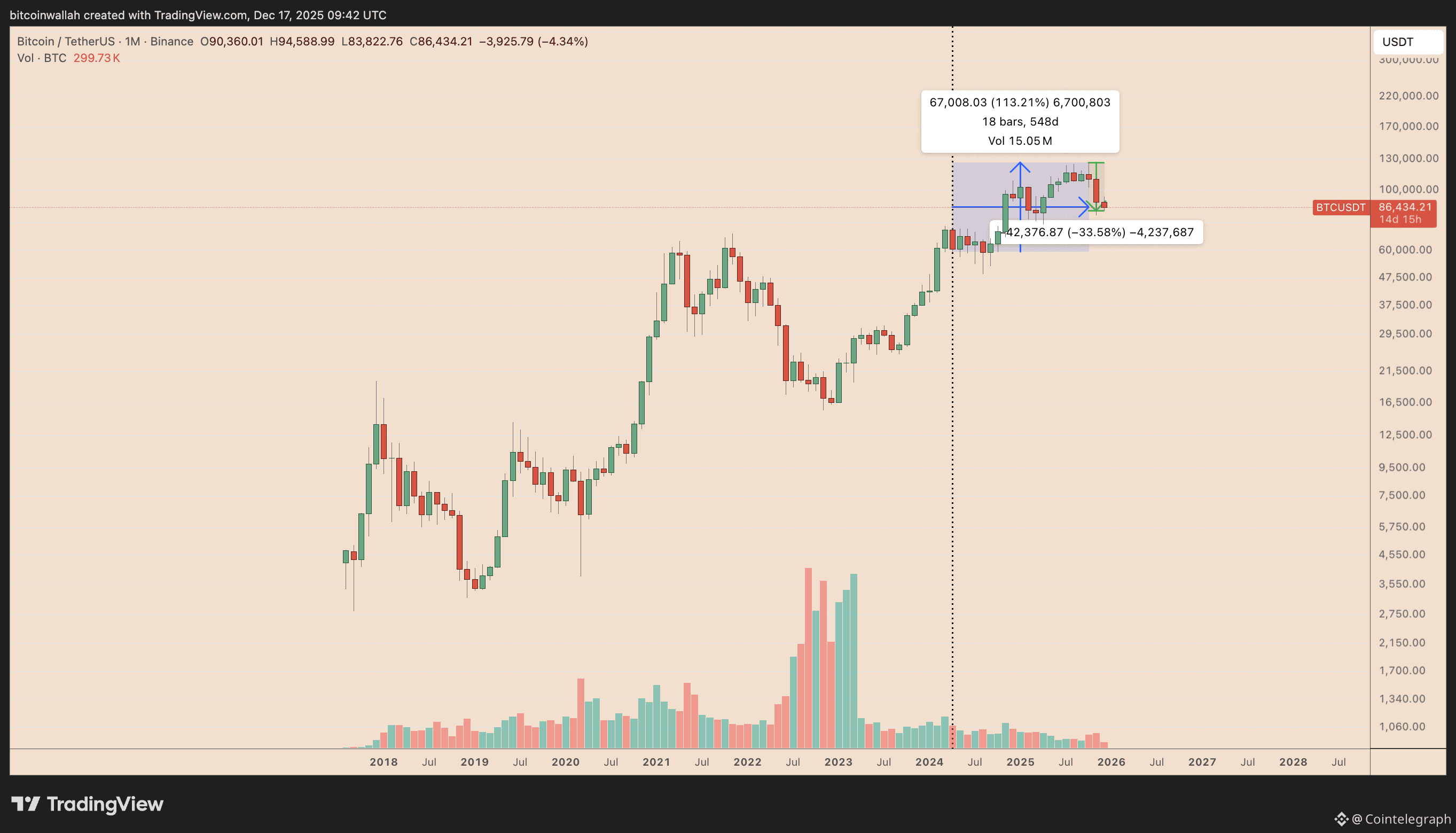 This time was no different. Bitcoin peaked near $126,200 in October, exactly eighteen months after the April 2024 halving, before declining by more than 30%.