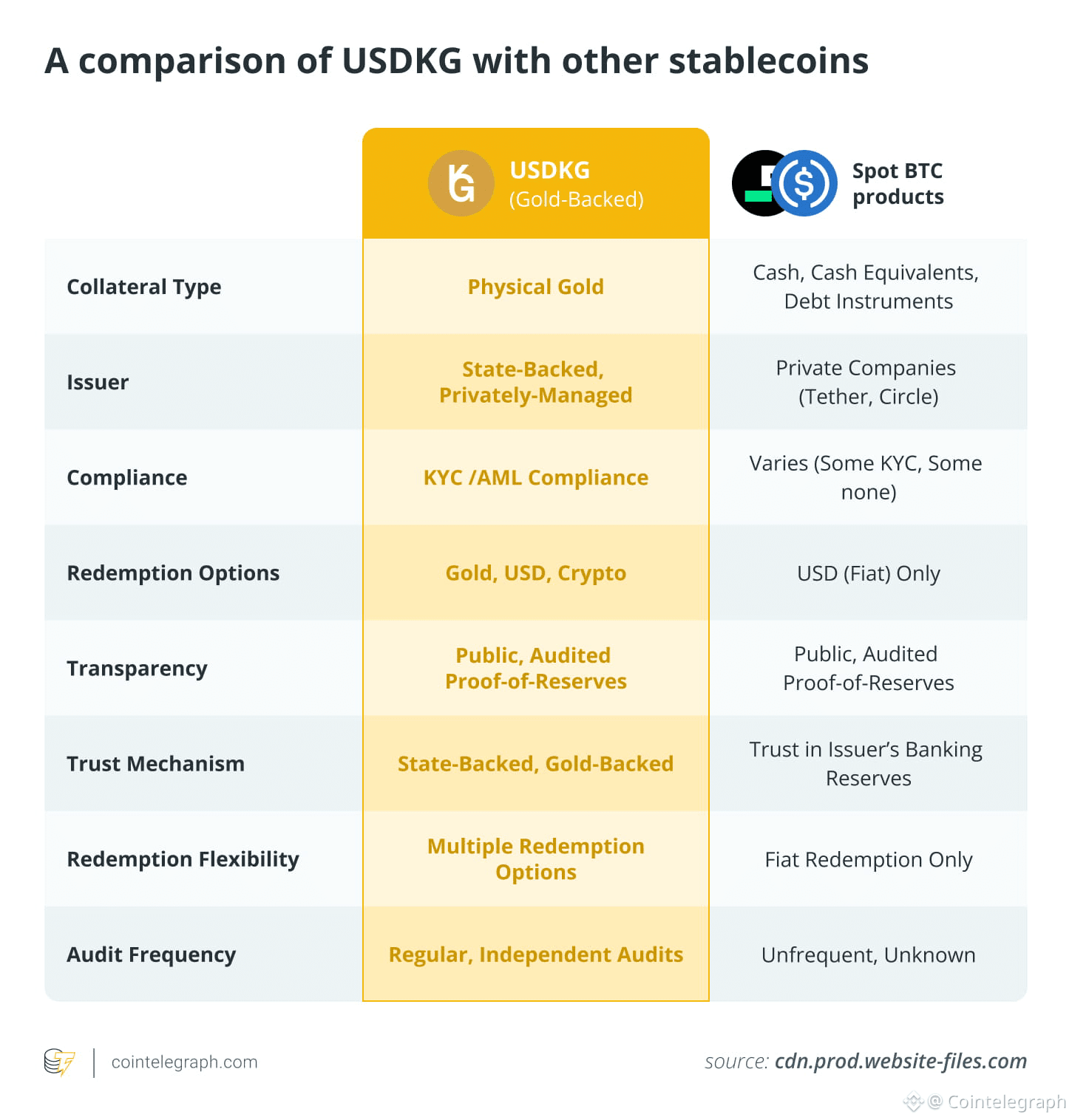 USDKG is positioned as a hybrid model, combining a USD unit of account with a gold-reserve narrative and a state-linked issuer structure.