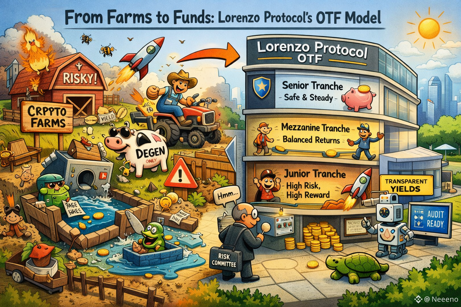 That shift is part of why @Lorenzo Protocol OTF model has been getting attention lately. OTF, or On-Chain Tranche Finance, sounds technical at first, but the idea behind it is surprisingly familiar. Instead of everyone taking the same risk and earning the same variable return, yield is split into structured pieces. Some participants want steadier outcomes. Others are willing to accept more uncertainty for higher upside. The protocol organizes these preferences on-chain, using smart contracts instead of desks and spreadsheets.