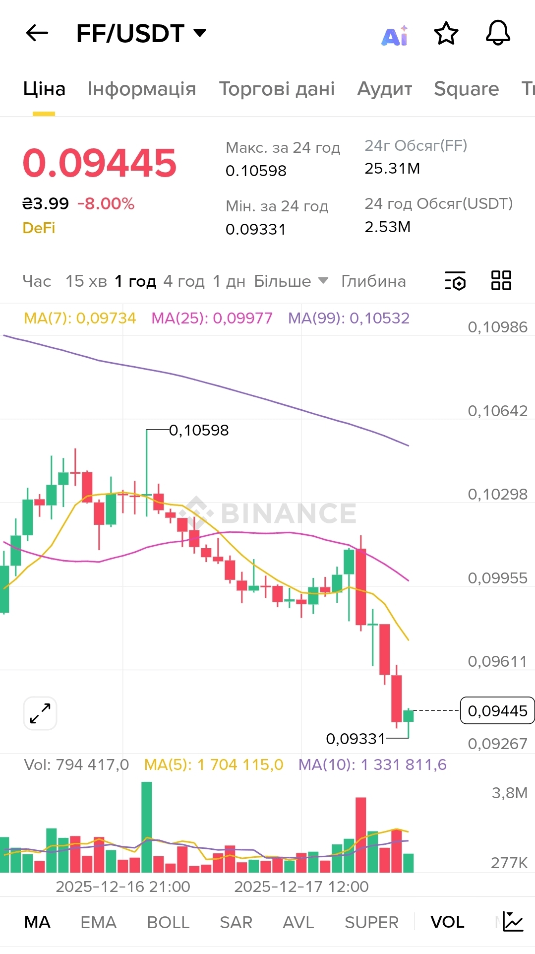 Look at the current chart \u003cc-46/\u003e— price 0.09445 USDT, a drop of a horrific 8.00% for the day. In the last 24 hours, the maximum was 0.10598, the minimum 0.09331—this is a fluctuation of 13.6%. These are the moments that are the most psychologically challenging. You see how in a day you lose almost 14% of your value, and panic starts in your head. But now imagine: instead of just watching these numbers in helplessness, you had already staked some of your tokens in #FalconFinance and received USDf. You already have liquidity in hand, and you can breathe easily. The psychological pressure instantly decreases.