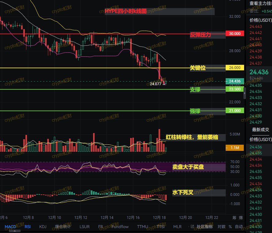 Indeed, multiple whale addresses have crazily purchased over 17 million USD worth of HYPE, and even a giant whale has a buy order waiting at 15 USD to bottom fish. However! Those in the crypto circle understand one principle: if good news doesn't lead to a rise, there must be something wrong. With such large funds buying in, the price can't even push past 26, what does it indicate? Either there is significant selling pressure in the market, or whales are slowly accumulating at low levels, not in a hurry to pump the price. Don’t treat the cost of whales as your life-saving symbol!