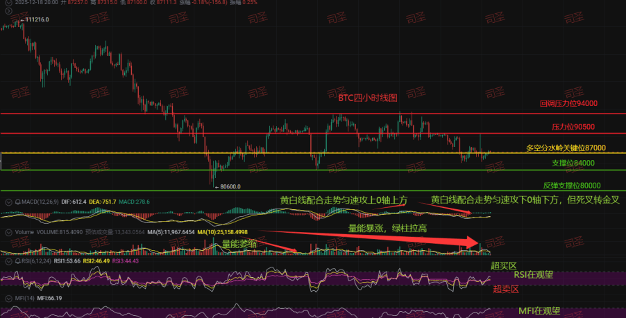 From the chart, the two MACD lines did indeed golden cross below the zero axis, suggesting a rebound, right? But the trading volume is shrinking! What does this indicate? The bulls have not genuinely rushed in. It's like a car, the engine roars but the fuel tank is empty, how far can it go? The upper resistance level of 90500 is a hurdle, and 94000 is even more of a pressure line. A rise now is likely a trap for the bulls. Tonight, pay close attention to the 87000 long-short watershed; if it can't hold, be cautious of a sharp decline.