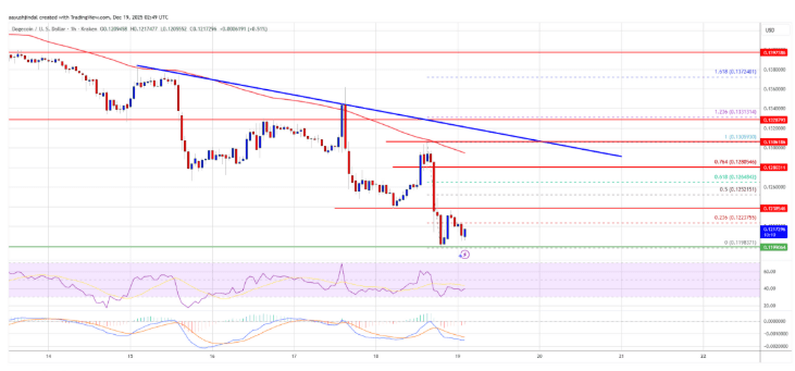 The current situation is that Dogecoin is stuck in an awkward position—'playing dead' below the 23.6% Fibonacci retracement level from the peak of $0.1305 to the low of $0.1198. Furthermore, and more critically, it not only broke below $0.1280 but also lost the 100-hour simple moving average, with short-term bearish signals fully displayed.