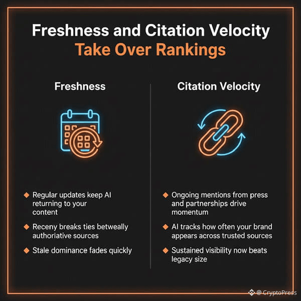 As the infographic states, “Sustained visibility now beats legacy size.” This is massive news for newer crypto projects. You don’t need to be Bitcoin or Ethereum to rank in AI answers; you just need more current momentum.