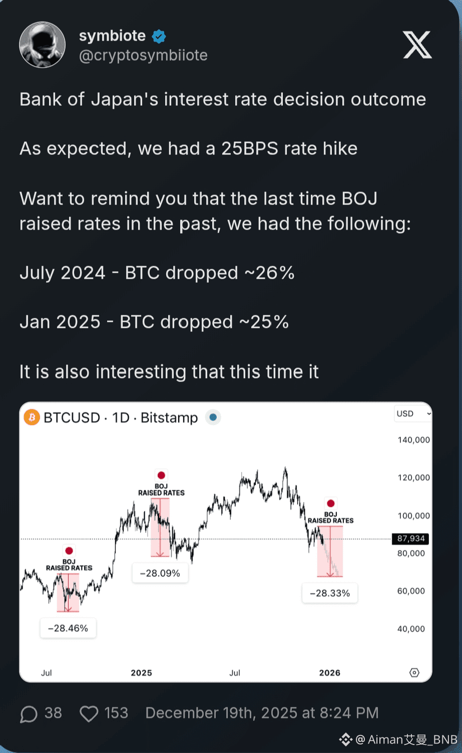 Just a few hours earlier, the Bank of Japan interest rate decision came,👉(Global markets, including crypto, are under pressure as investors await the Bank of Japan’s expected 25 bps rate hike to 0.75% at its December 18–19 meeting, which would be the first increase in 11 months and the highest level in decades. Even without official confirmation, markets have largely priced it in, reviving fears of yen carry trade unwinding—where higher borrowing costs force investors to exit leveraged positions in risk assets like Bitcoin and altcoins. This uncertainty comes just days after a U.S. Fed rate cut that paradoxically triggered volatility and declines across crypto, adding to confusion. Historically, BOJ tightening cycles have coincided with sharp Bitcoin corrections, fueling concerns of further downside, while current price action shows mixed signals as traders remain cautious. Overall, the crypto market remains highly sensitive to central bank moves, with Japan’s policy decision seen as a key factor that could either trigger deeper deleveraging or mark a final shakeout before stabilization.)👈 which increased by 25 basis points (0.25%). For the past 30 years, the government kept rates at zero or even negative.