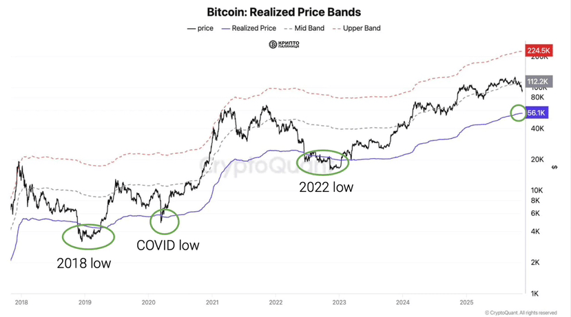 📌 CryptoQuant highlights that ~$56,000 corresponds to the realized price and would represent the smallest historical drawdown for a bear market