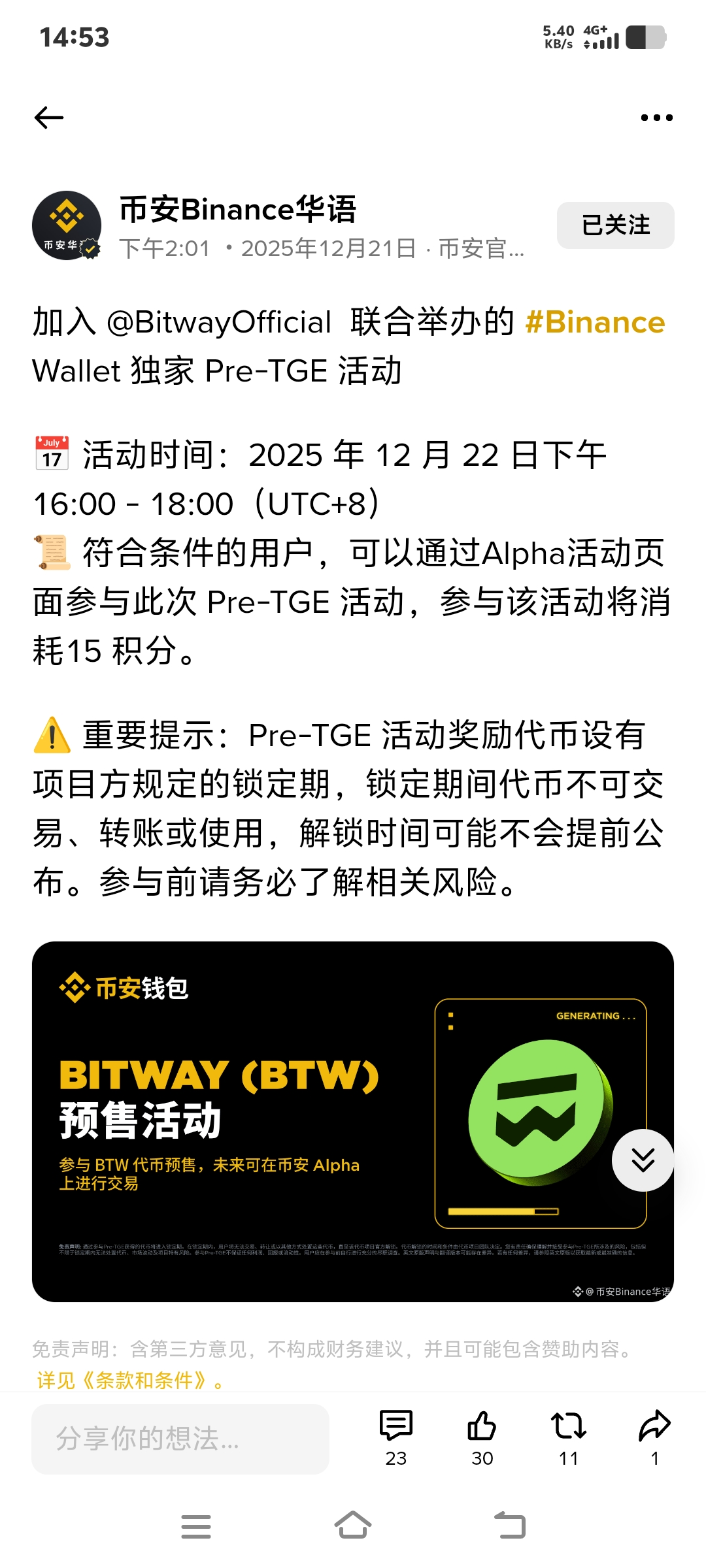 Tomorrow's new TGE BTW token, the threshold is likely to be above 220 points, which is different from the past, cannot be traded, but tasks can still be completed!
