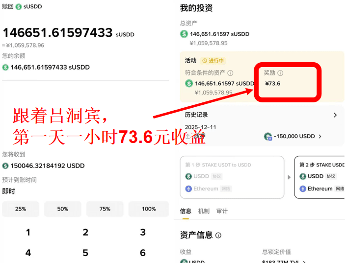 Thirdly, regarding earnings, depositing 150,000 U for 24 hours yields 56U, including a basic annualized return of 46U at 12% and an activity annualized return of 10U. The basic annualized return is fixed and guaranteed without restrictions, while the activity annualized return is variable. After 4 weeks from the end of the activity, it will be distributed. Currently, the official website shows that the TVL of sUSDD on Ethereum has reached 176 million USD, far exceeding expectations.#USDD以稳见信 @USDD - Decentralized USD