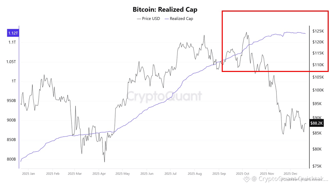 On-chain metrics show that Bitcoin’s Realized Cap, which had expanded steadily for roughly two and a half years, has flattened over the past month. This indicates that while price volatility persists, net new capital inflows have stalled. The lack of follow-through on price rebounds can be largely explained by this structural slowdown in capital entering the network.
