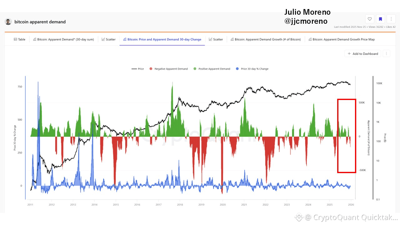 In addition, 30-day apparent demand continues to trend lower, with successive peaks declining over time. Compared with prior bullish phases, buying pressure appears limited and insufficient to consistently absorb supply. As a result, Bitcoin has struggled to maintain higher price levels, increasing its sensitivity to downside moves.