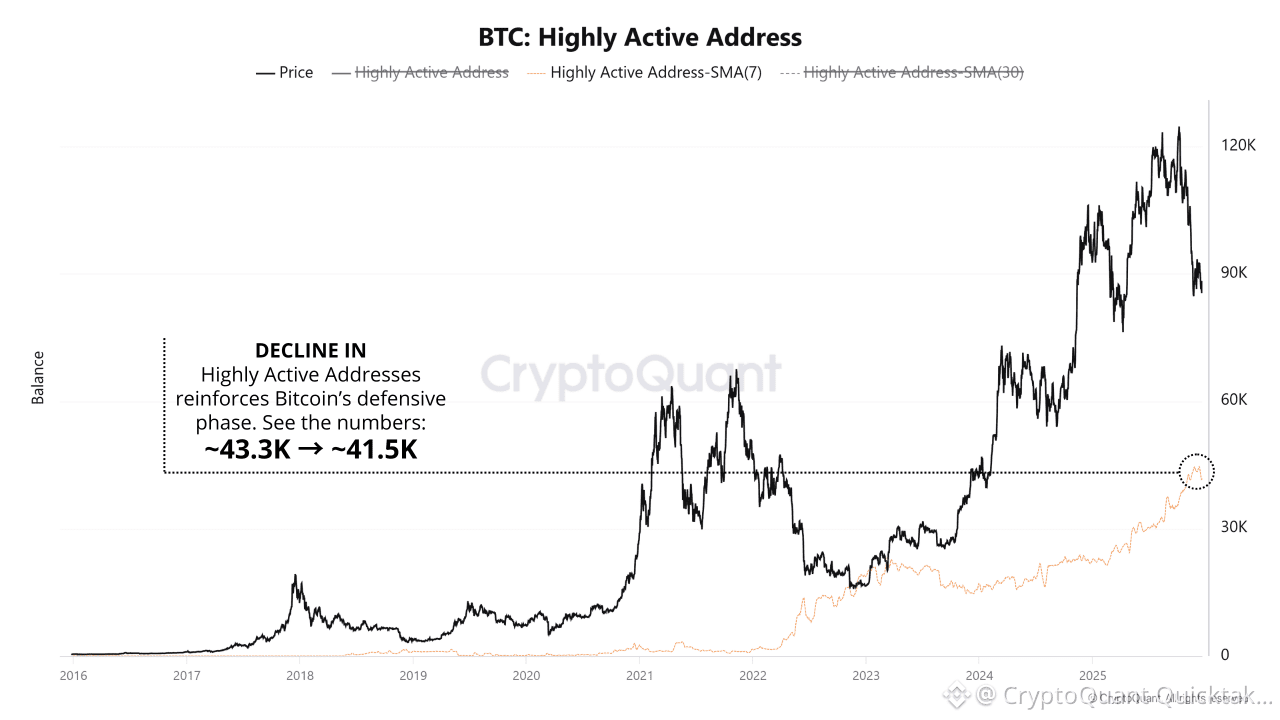 ◾ Highly Active Address → decline from 43.3K to 41.5K → fewer large players active, consistent with a defensive phase. Historically, when highly active addresses shrink, it signals retreat by traders and institutions, reinforcing the transition into quiet accumulation phases that precede future volatility.