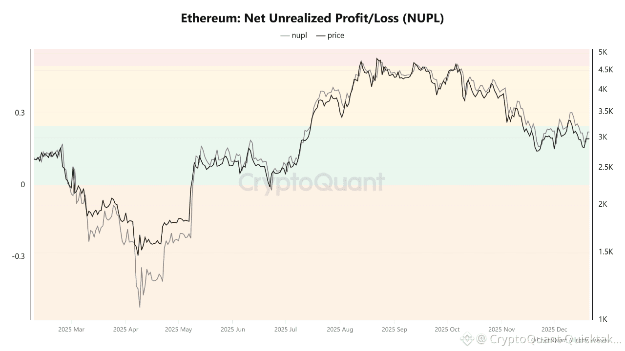 The NUPL indicator shows that the market remains in positive territory, with the latest reading around 0.22. This level indicates that the average Ethereum holder is still sitting on unrealized profits, but these profits are moderate rather than excessive. Historically, this zone is classified as a phase of belief or cautious optimism, not euphoria. This suggests the market has not yet reached a dangerous psychological peak, while also no longer being in a fear or capitulation phase.
