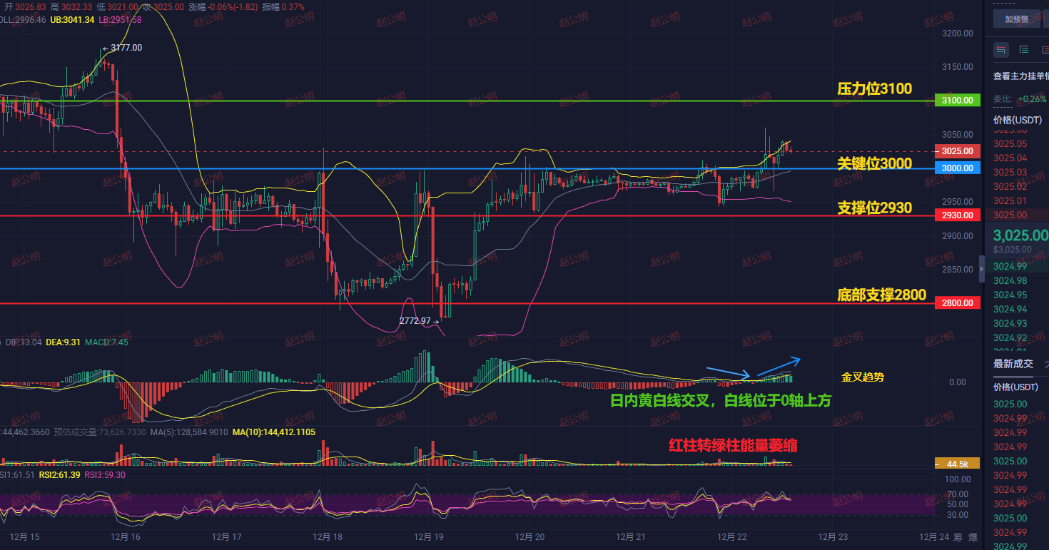 Zhao Gongming's judgment is: Under the contradiction of macro pressure and the main force's 'paper long', ETH is very likely to continue to fluctuate narrowly between 3000-3100 tonight, and the probability of a unilateral market is low.