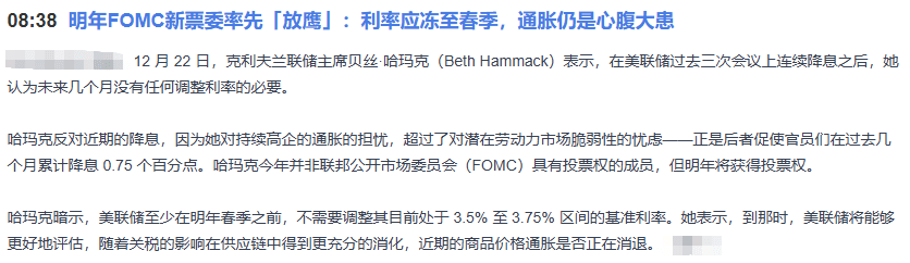 This morning, a Federal Reserve official with voting rights for next year suddenly 'hawkish', saying that inflation is still a major issue and interest rates should remain frozen until next spring. This translates to: expectations for interest rate cuts need to cool down, and the 'water' in the market will not increase temporarily. This is a short-term emotional suppression for all risk assets, including ETH.