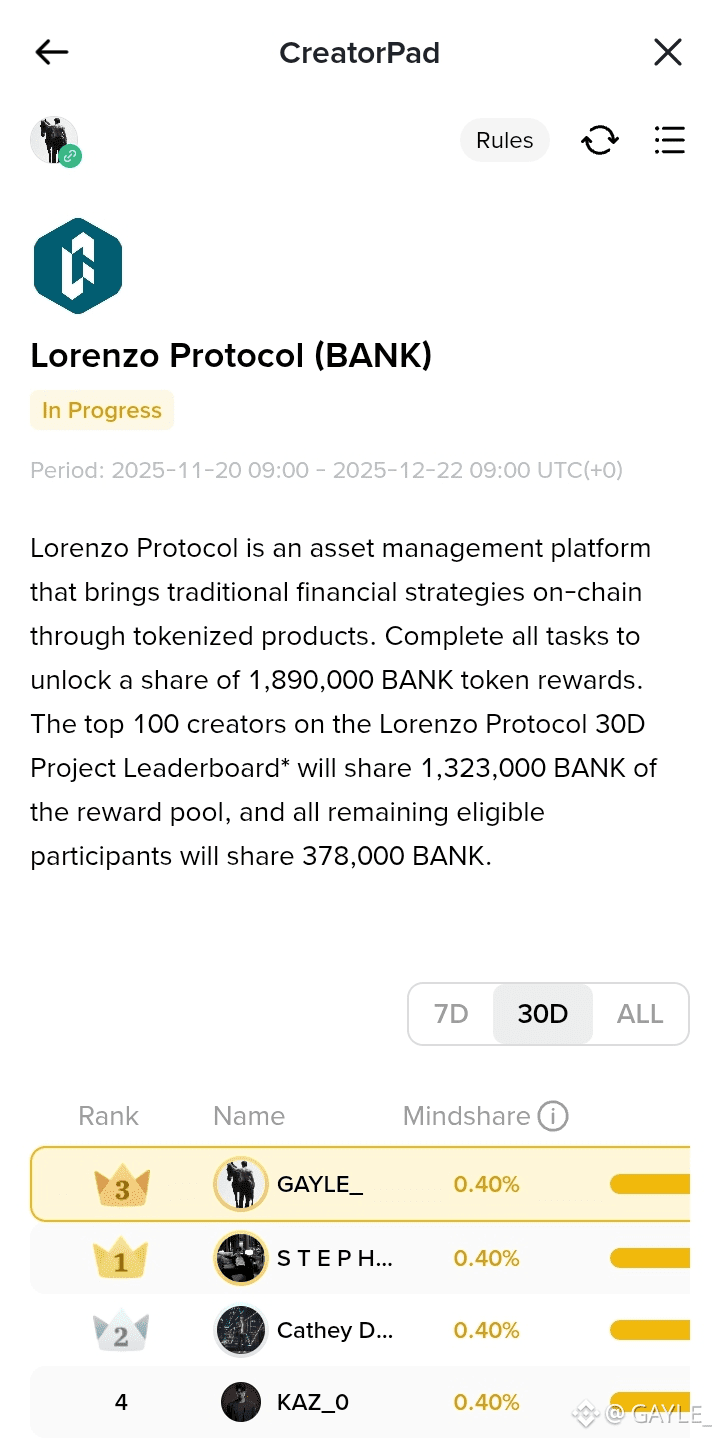 In the most recent Lorenzo Protocol campaign, I remained in the Top 3 of the 30-day leaderboard. This was not a short-term spike or a temporary placement. It was sustained performance built through original research, human-written analysis, and continuous effort.