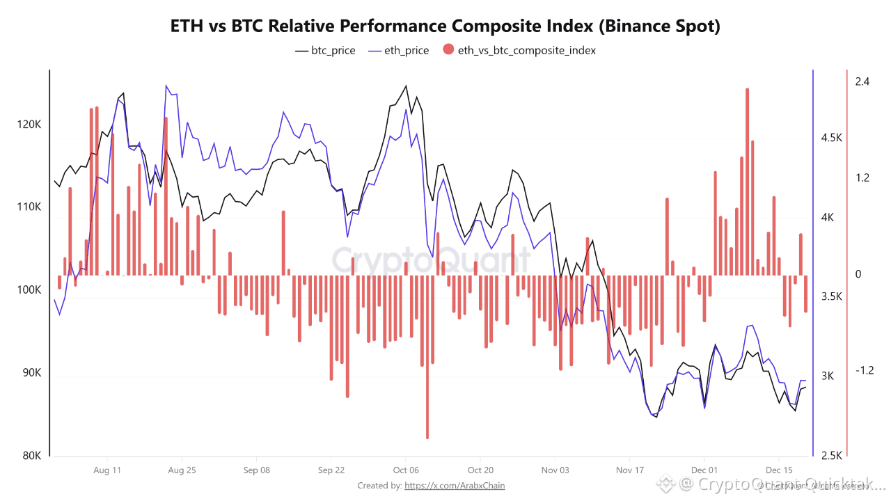 The combined reading of the ETH vs BTC composite indicator and the relative volatility between Ethereum and Bitcoin on Binance provides an accurate picture of the market’s current position within the broader risk cycle The composite indicator which integrates relative price momentum, trading volume ratio, and the price ratio between ETH and BTC currently hovers around -0.46.