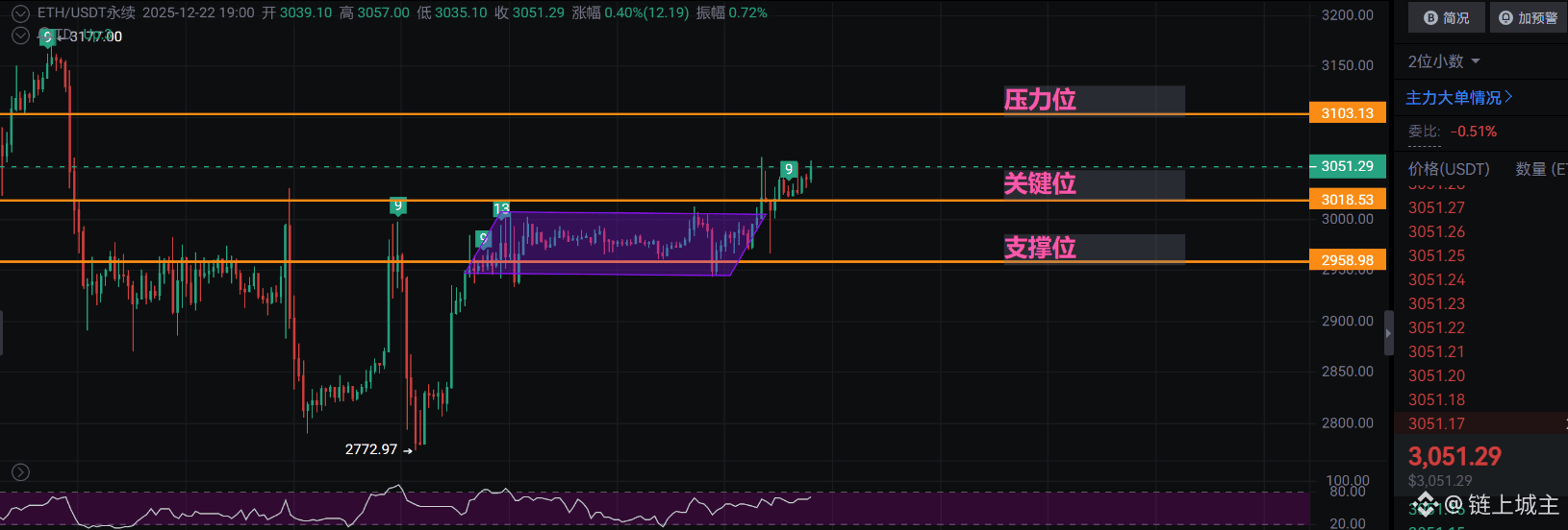 ETH在2772触底后走出“V型反转”,现在卡在3018关键位和3103压力位之间。注意这两个细节: