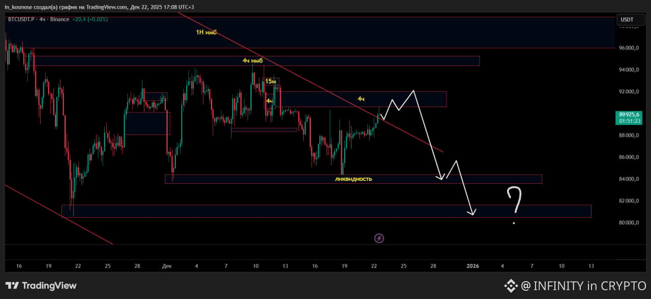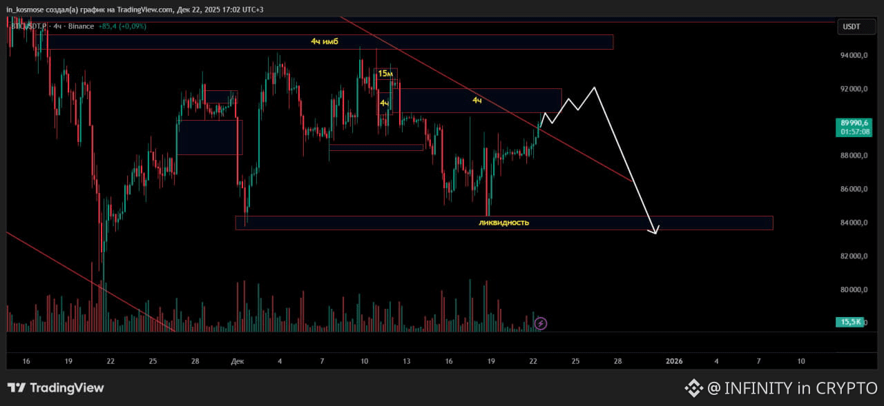 Идея: цена взаимодействует с ликвидностью в зоне $90-$92k (вплоть до резкого закола), но после этого не закрепляется и возвращается в работу диапазона $85–$90k. Внутри коридора возможны девиации вниз со снятием стопов.
