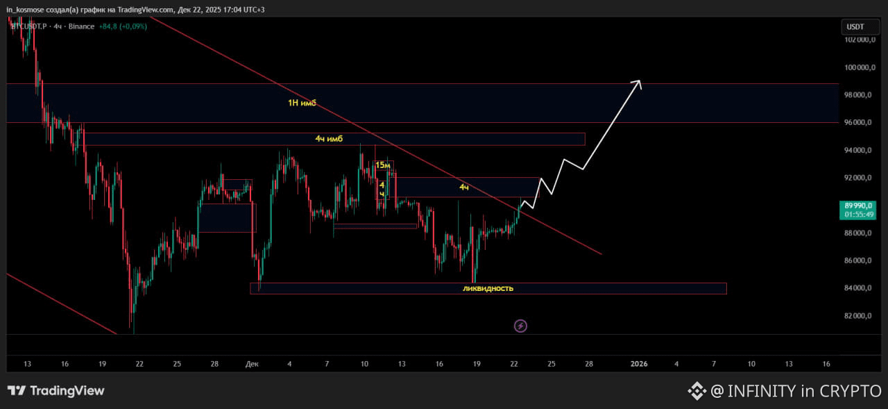 Если рынок принимает цену выше 90k и начинает снимать стопы шортов над хаями, появляется шанс выйти из вялого диапазона и протянуть движение к следующей зоне ликвидности $96-$100k. Ключевое условие — закреп, а не разовая всплеск с большой тенью.