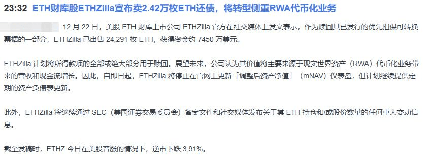 The most explosive news today is that the US stock market company ETHZilla, which holds a large amount of ETH, sold more than 24,000 ETH in one go, raising about 74.5 million USD to pay off debts. As soon as the news broke, its stock price fell nearly 4% yesterday while the US stock market generally rose. On the surface, this is definitely a selling pressure, indicating a short-term bearish sentiment.