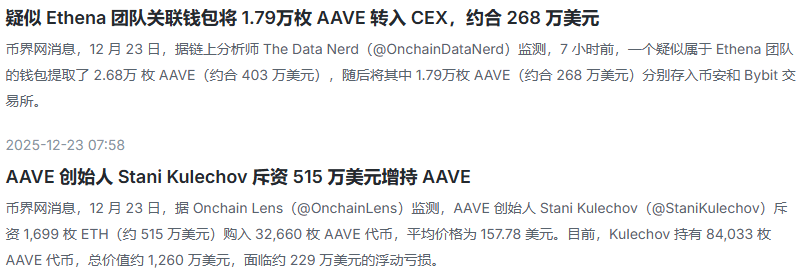 On one side is a suspected Ethena team's wallet, quietly moving nearly 20,000 AAVE (worth 2.68 million USD) to Binance and Bybit, clearly preparing to sell.