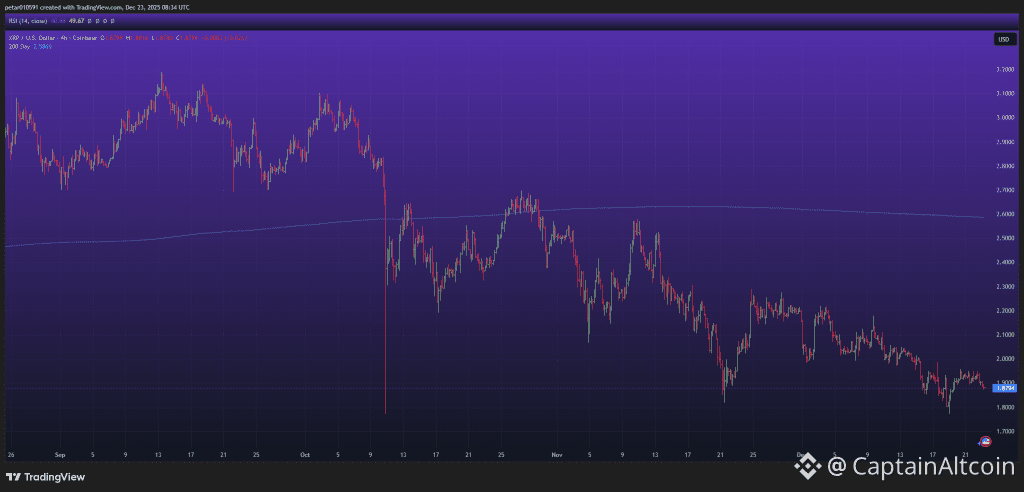On the XRP chart, the broader structure remains weak, but there are signs of exhaustion. Price has been trending lower since early October, with consistent lower highs and lower lows. The move down accelerated after losing the 200-day moving average, which now sits well above price near the $2.60 area. That level acts as a major ceiling for any medium-term recovery.