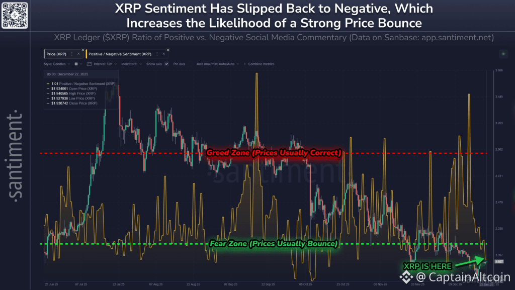 Santiment’s latest data shows that XRP sentiment has slipped back into clearly negative territory. The ratio of positive to negative social commentary is now sitting in what the platform labels the “fear zone.” Historically, this zone has lined up with periods where prices tend to stabilize or bounce rather than continue collapsing.