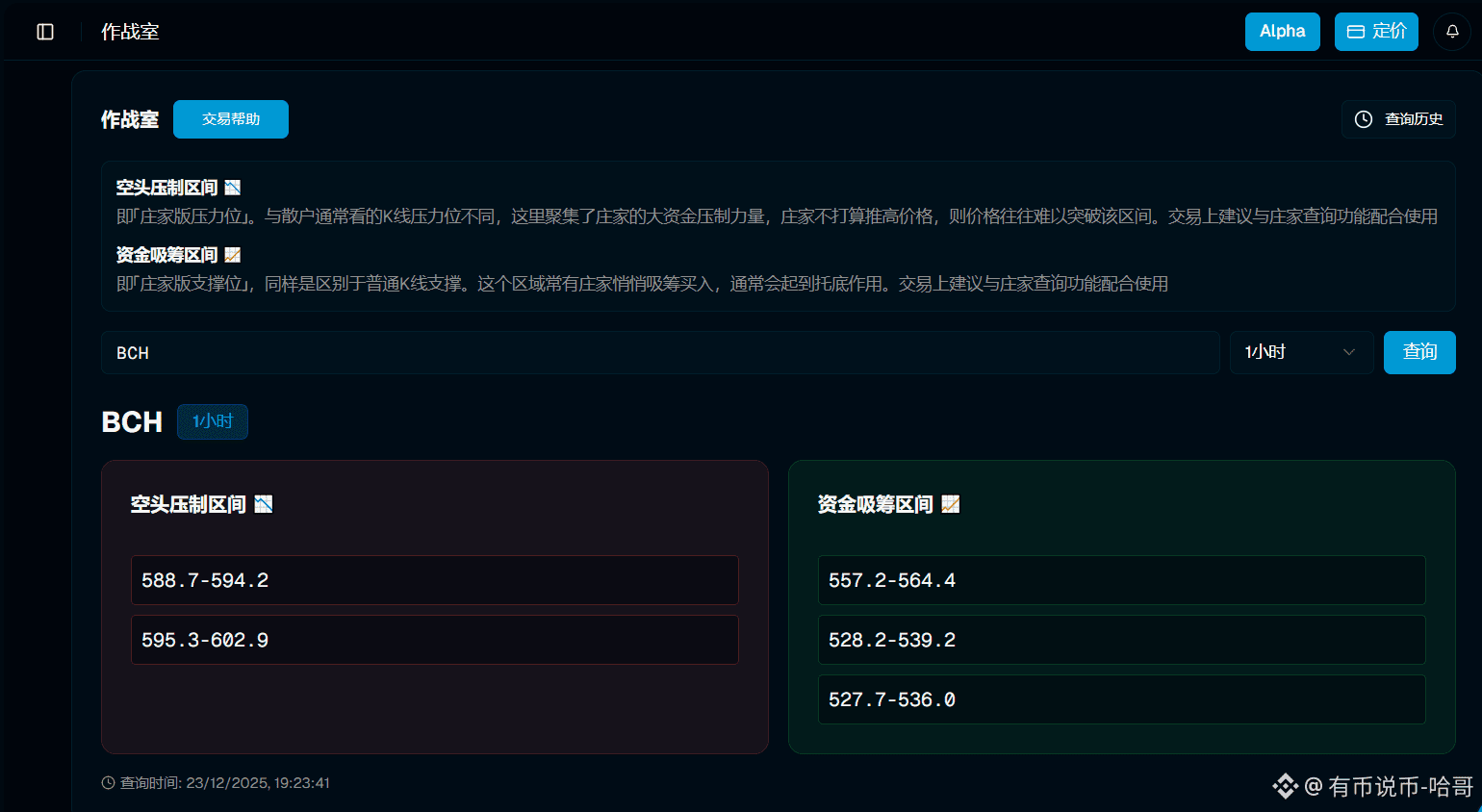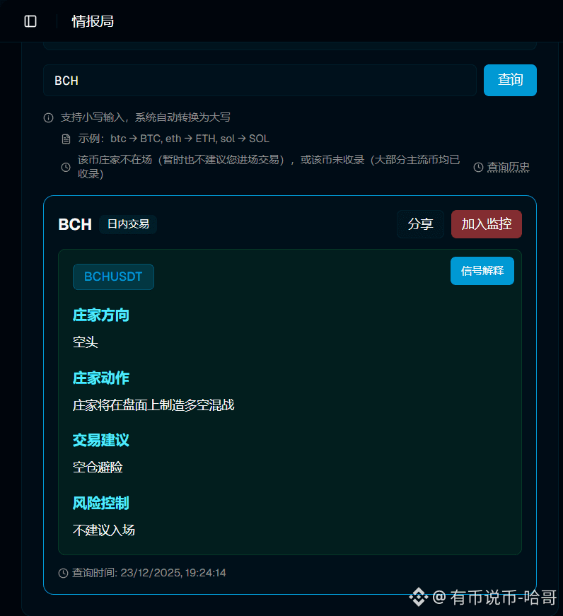 当前日期:2025年12月23日(情报局监控19:24:14),BCH现价约582.3 USDT。