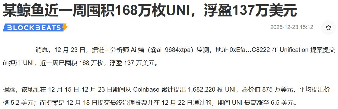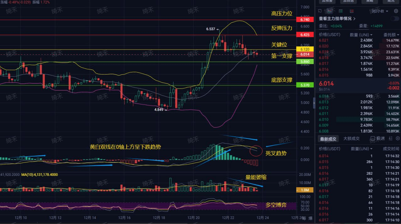 I am Qi He. I just came across a piece of news that made my heart skip a beat, a whale has secretly hoarded 1,680,000 UNI in a week, already making a profit of 1.37 million USD! Looking at the 4-hour chart again, the trend is clearly going down, and the MACD is crossing down from a high position. Are you also confused: is this coin going to surge to 6.425, or is it going to drop to 6.12 or even 5.86? Should we chase now or run?