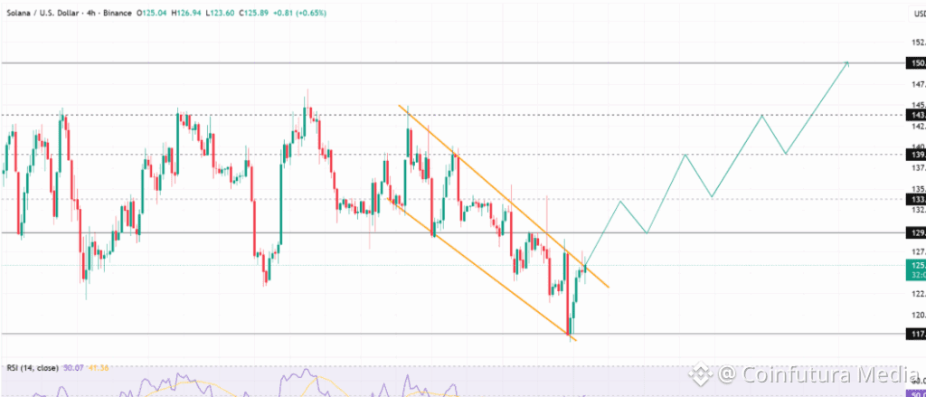 The timing of the treasury announcement aligns with significant shifts in Solana’s technical chart structure. SOL recently broke out of a falling channel, signaling a possible reversal in market control. After buyers defended the $117.70 support area, the price rebounded, reclaiming mid-channel levels and moving above the declining resistance line. As of reporting, SOL trades near $126, showing consolidation above key lows.