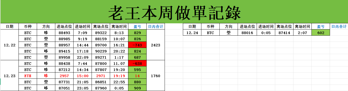 Lao Wang's intraday layout is also a back-and-forth operation of bulls and bears. Unfortunately, due to the early morning Asian market opening rise, it failed to push the coin price past strong resistance above, but instead fell back under pressure, causing an early morning position to be lost. Fortunately, the subsequent back-and-forth operations can also recover the losses. Although the points gained during the day are not particularly large, the frequency and win rate can compensate for it, allowing us to gain something in this tug-of-war market between bulls and bears.