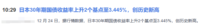Japan's 30-year government bond yield surged to 3.445%, a historical high.