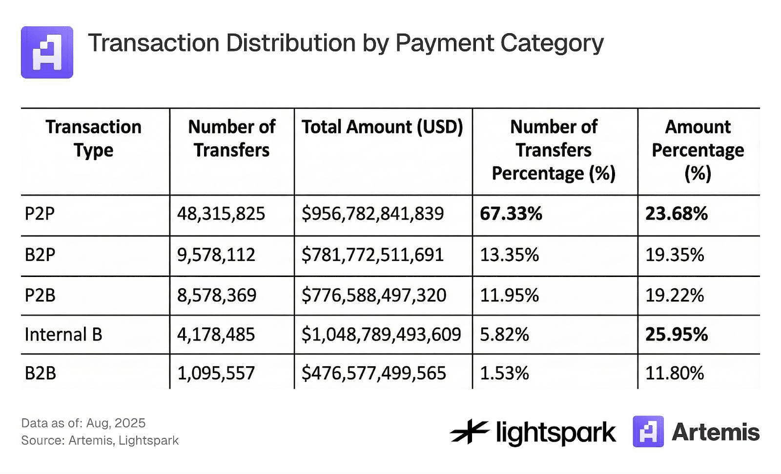 稳定币支付已接近全部交易量的一半,但高度集中在少数机构钱包中:前 1000 个地址贡献了约 85% 的转账规模,P2P 交易笔数虽多,金额占比却明显偏低