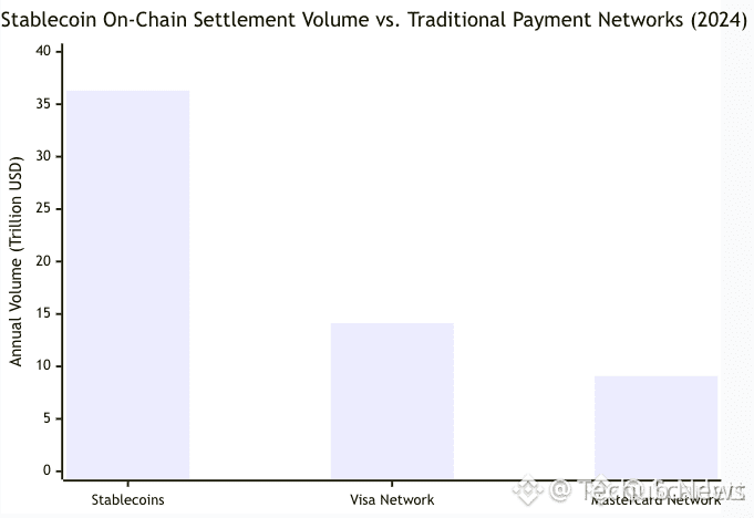 稳定币年度链上结算额达到36.3万亿美元,这一数字不仅首次超越Visa(14.1万亿美元) 与万事达卡(9.1万亿美元) 的年度交易量总和,更重要的是揭示了稳定币作为全球价值传输层的巨大潜力。它证明在区块链上,稳定币已经成为一个吞吐量巨大的结算网络。