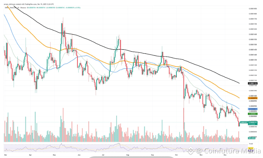 Shiba Inu (SHIB) continues to trade under key moving averages, highlighting the ongoing dominance of sellers in the broader market structure. The asset remains in a sustained downtrend, with price action confirming a lack of upward momentum on the daily chart.