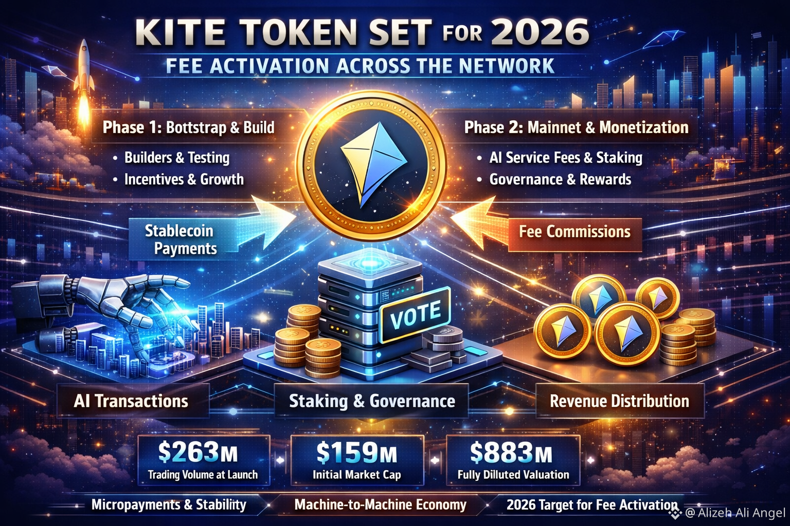 KITE’s planned fee activation for 2026 is drawing attention for a simple reason: it ties the token to network usage in a way that the early phase does not. Kite’s own tokenomics describe a two-phase rollout. Phase 1, around token generation, focuses on bringing builders and modules into the ecosystem and bootstrapping activity. Phase 2 is linked to mainnet, and it is where commissions on AI service transactions, staking, and governance are expected to become live. That sequencing matters because it changes what “participation” means. In the first phase, participation looks like building, testing, and qualifying for incentives. In the second, participation looks like carrying some responsibility for the network’s economic plumbing, whether you are running infrastructure, operating a module, or simply voting on how the system evolves.